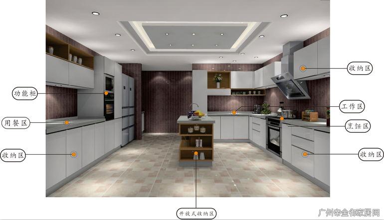 南方空氣環境濕潤,廚房地板不時會潮濕,廚房踢腳線設為八厘米,不僅可有效防蟑螂老鼠而且防潮性極佳,不會因霧水的滲入使櫥柜壽命降低,且柜體采用防潮板可大大提高櫥柜壽命。櫥柜右邊為L型工作臺,可在其進行工作烹飪,吊柜門板采用百隆自動感應開關鉸鏈所以沒有設計拉手,櫥柜中島下方設計為開放式,可放置水杯等小零件物品,櫥柜左邊為一字型餐桌加功能柜,可在此進行用餐,一家人坐在一排享受便捷生活帶來的快樂與溫馨。