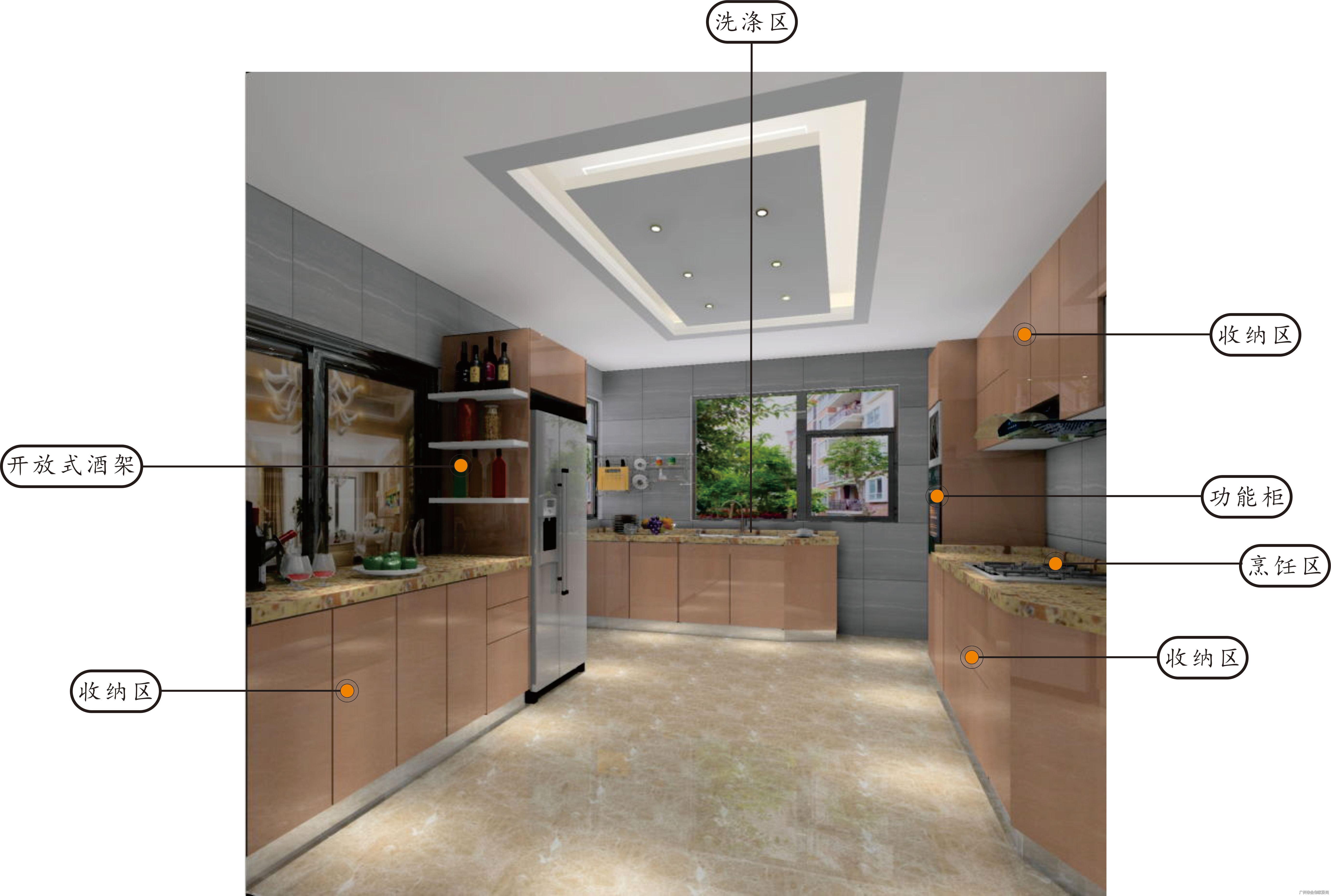 櫥柜為開放式,空間寬裕,右邊為工作區與烹飪區,窗口下是洗滌區,在洗碗時看看窗外不會顯得那么枯燥無味。櫥柜門板采用光面晶鋼板,晶鋼板門板板材最大的特點就是極具防撞防刮。櫥柜左邊為一字型餐邊酒柜,用餐時段可作為餐桌進行用餐,旁邊多余空間還嵌入了雙開門冰箱增加空間飽滿度。地柜設計踢腳線可有效防蟑螂老鼠。