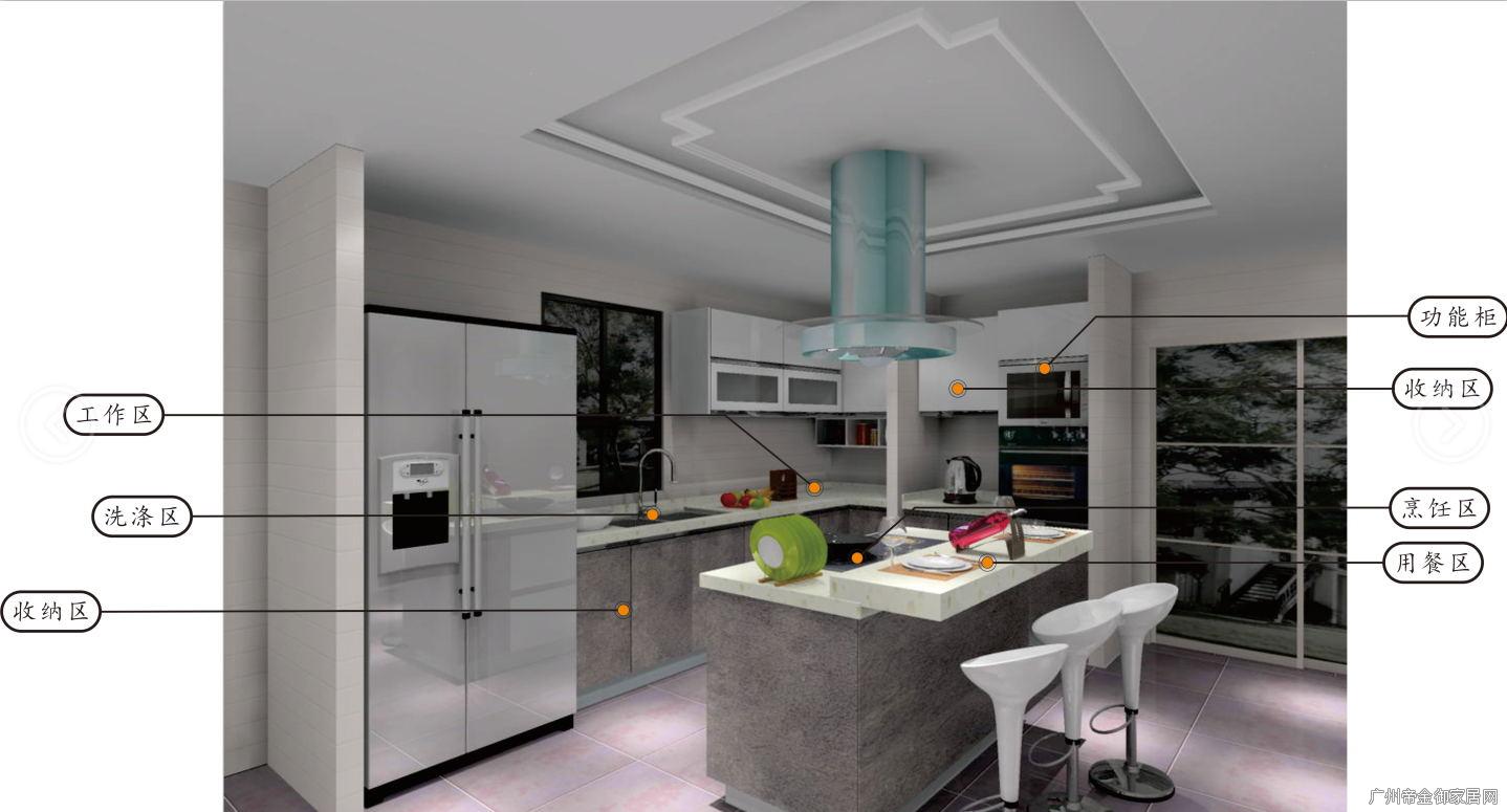 廚房空間較小,為了保持工作臺的長度便將工作臺延伸至L型。櫥柜計價方式是按米算, 將冰箱嵌入廚房減少櫥柜長度米數。將冰箱嵌入廚房不僅方便許多,而且由于冰箱的嵌入從而在價格性價比方面得到提升。吊柜下方安置開放式小柜格可放置常喝的茶類等物品。櫥柜中間安置中島,由于廚房空間較小,設計師將烹飪區置入中島,由于用餐區得在廚房進行,中島又被爐頭霸占,設計師便將中島邊緣上方安置石英石從而實現延伸,即可在中島進行烹飪還能進行用餐,便無需將菜品左右端至其他區域。實現安全與便捷。