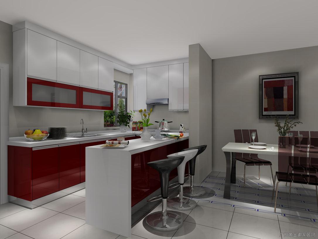 櫥柜左邊高柜安置冰箱與功能柜,增加收納儲(chǔ)物空間與空間飽滿度地柜設(shè)計(jì)為咖啡紅色顯得廚房整體更加活躍氣氛。